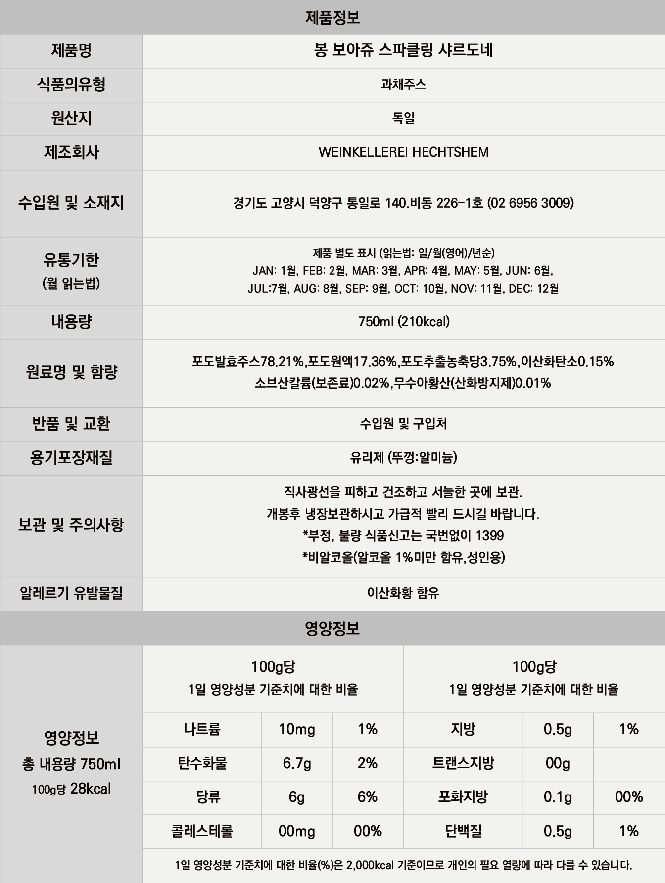 봉보야쥬의 논알콜 스파클링 화이트 와인 입니다.